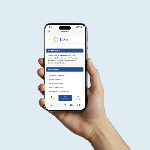 Professionele ondersteuning bij geldzaken? Die krijg je via de Fizo-app. Je gebruikt ‘m kosteloos en kiest zelf wat je met ons deelt. Altijd en overal.